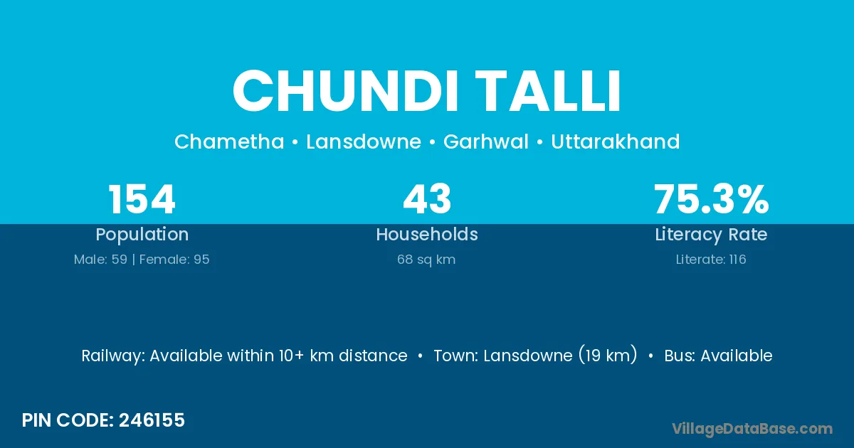 Lansdowne (19 km) is the nearest town to Chundi Talli village for major economic activities and is located approximately 19 km away.
