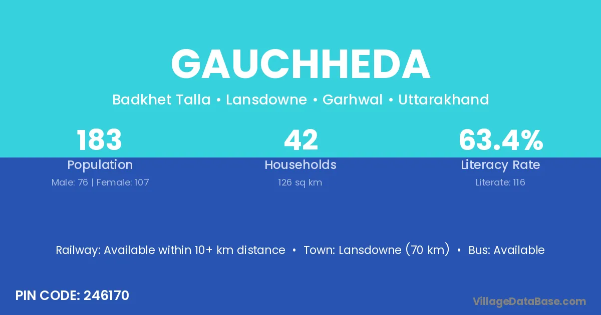 Lansdowne (70 km) is the nearest town to Gauchheda village for major economic activities and is located approximately 70 km away.