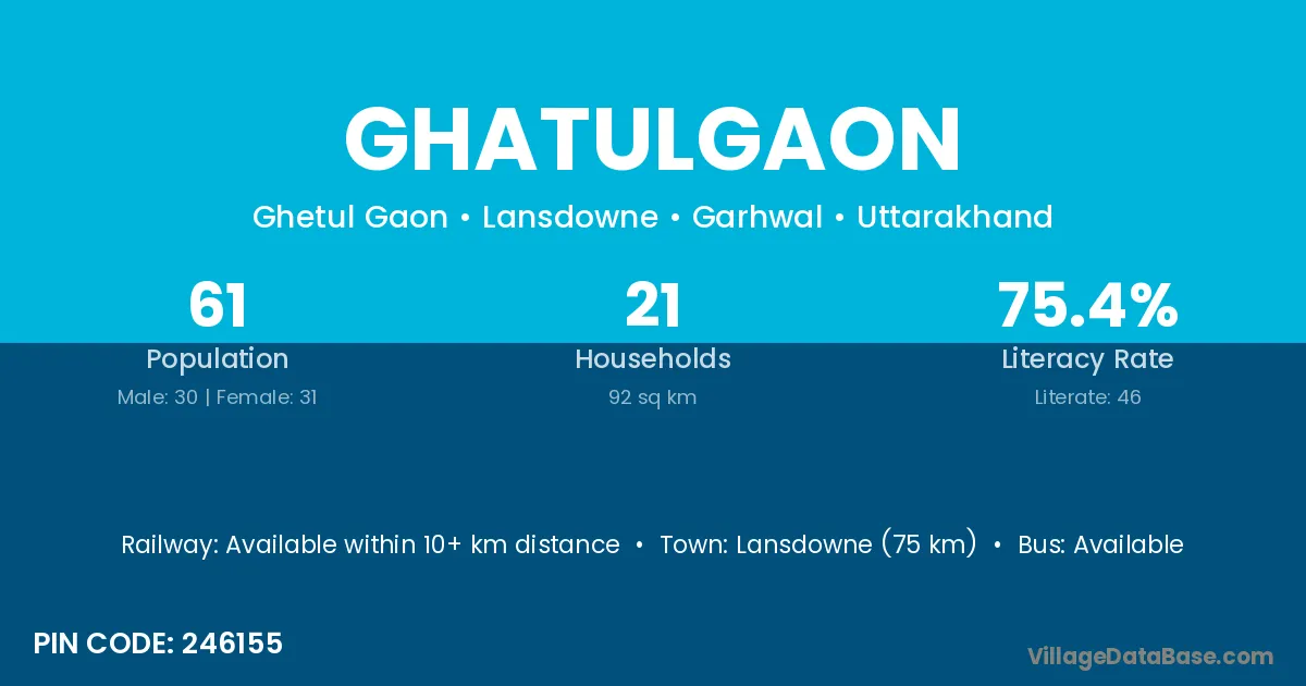 Lansdowne (75 km) is the nearest town to Ghatulgaon village for major economic activities and is located approximately 75 km away.