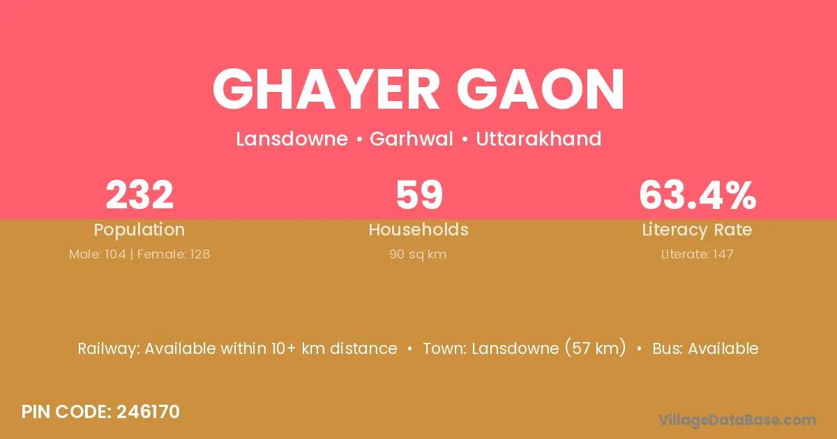 Lansdowne (57 km) is the nearest town to Ghayer Gaon village for major economic activities and is located approximately 57 km away.