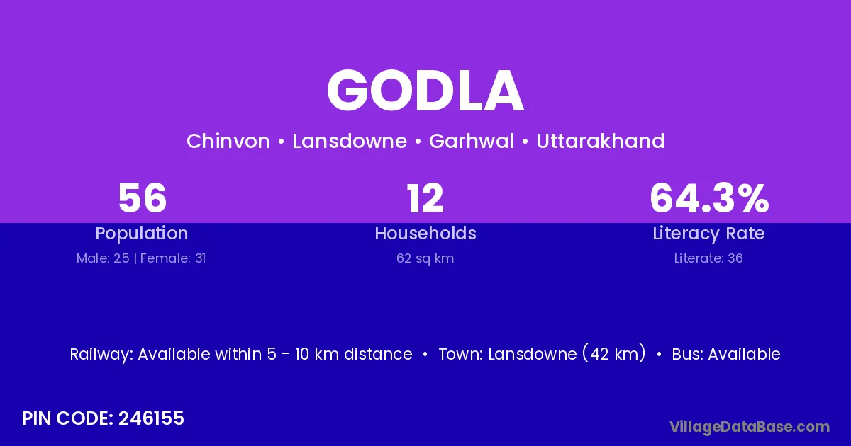 Lansdowne (42 km) is the nearest town to Godla village for major economic activities and is located approximately 42 km away.