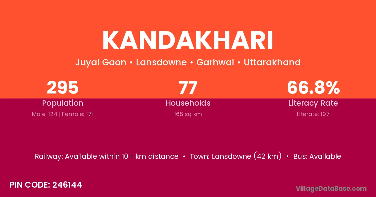 Lansdowne (42 km) is the nearest town to Kandakhari village for major economic activities and is located approximately 42 km away.
