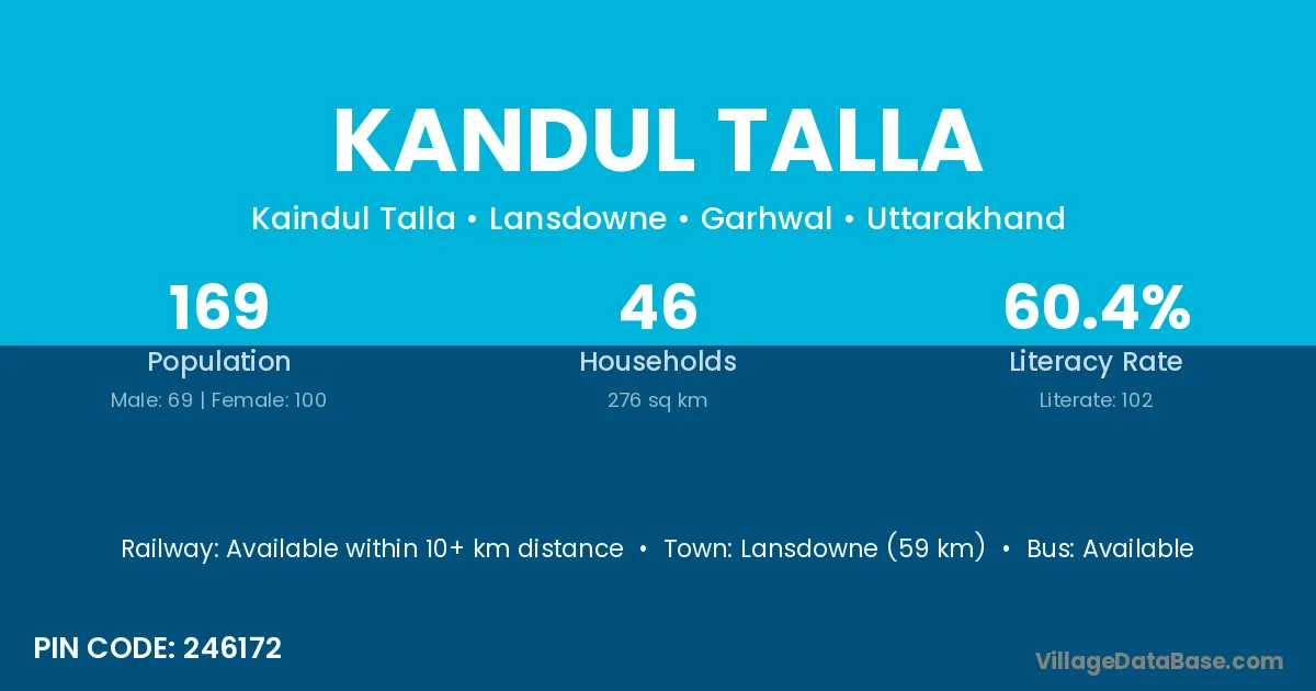 Lansdowne (59 km) is the nearest town to Kandul Talla village for major economic activities and is located approximately 59 km away.