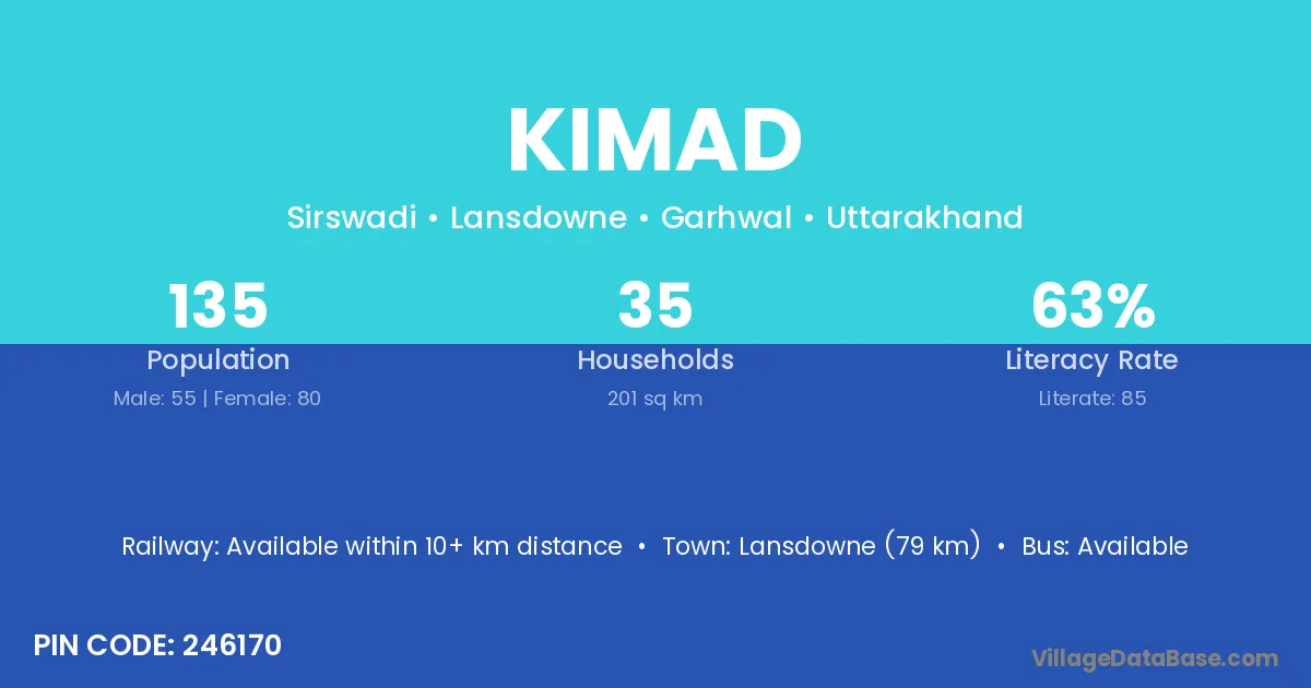 Lansdowne (79 km) is the nearest town to Kimad village for major economic activities and is located approximately 79 km away.