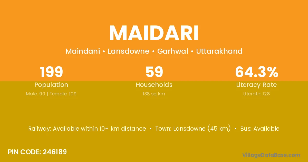 Lansdowne (45 km) is the nearest town to Maidari village for major economic activities and is located approximately 45 km away.