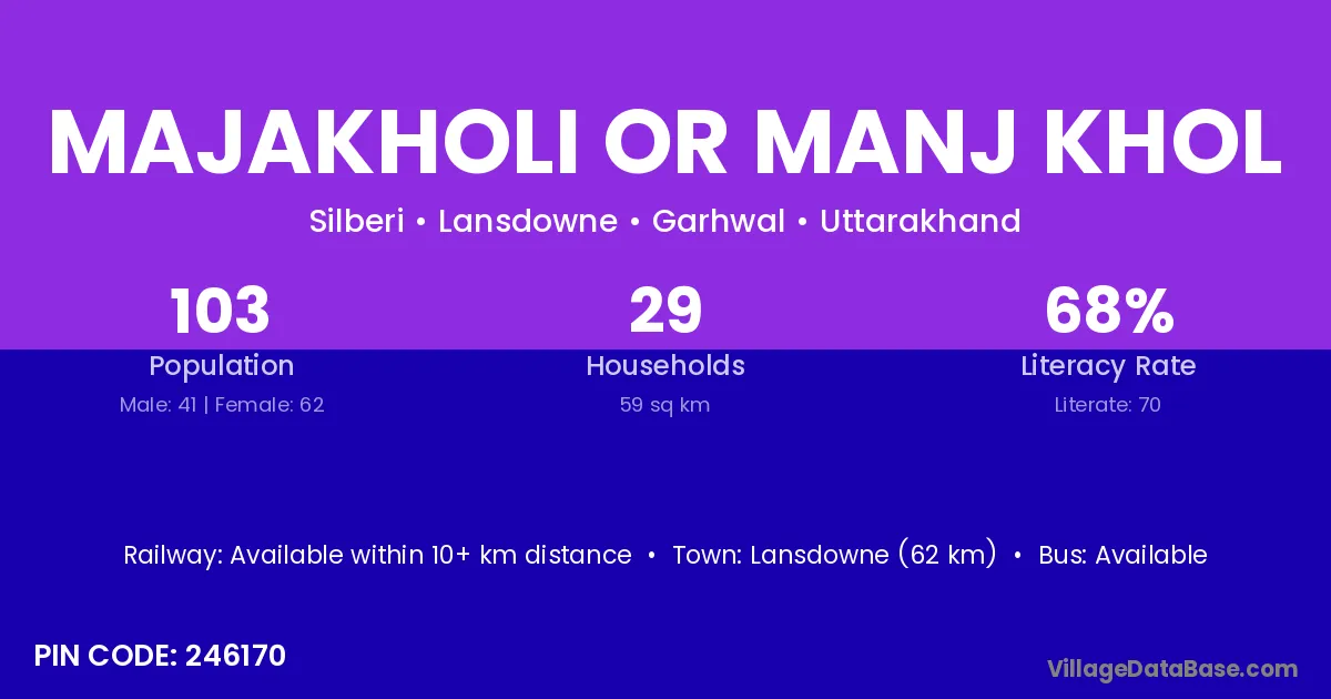 Lansdowne (62 km) is the nearest town to Majakholi Or Manj Khol village for major economic activities and is located approximately 62 km away.