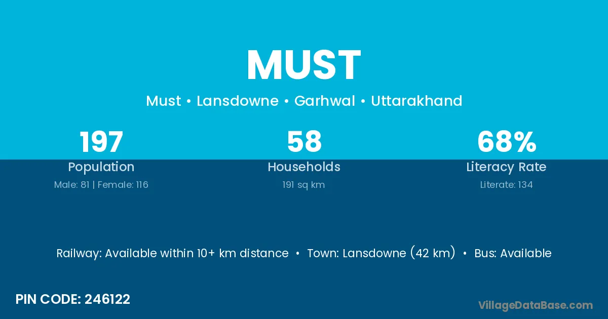 Lansdowne (42 km) is the nearest town to Must village for major economic activities and is located approximately 42 km away.