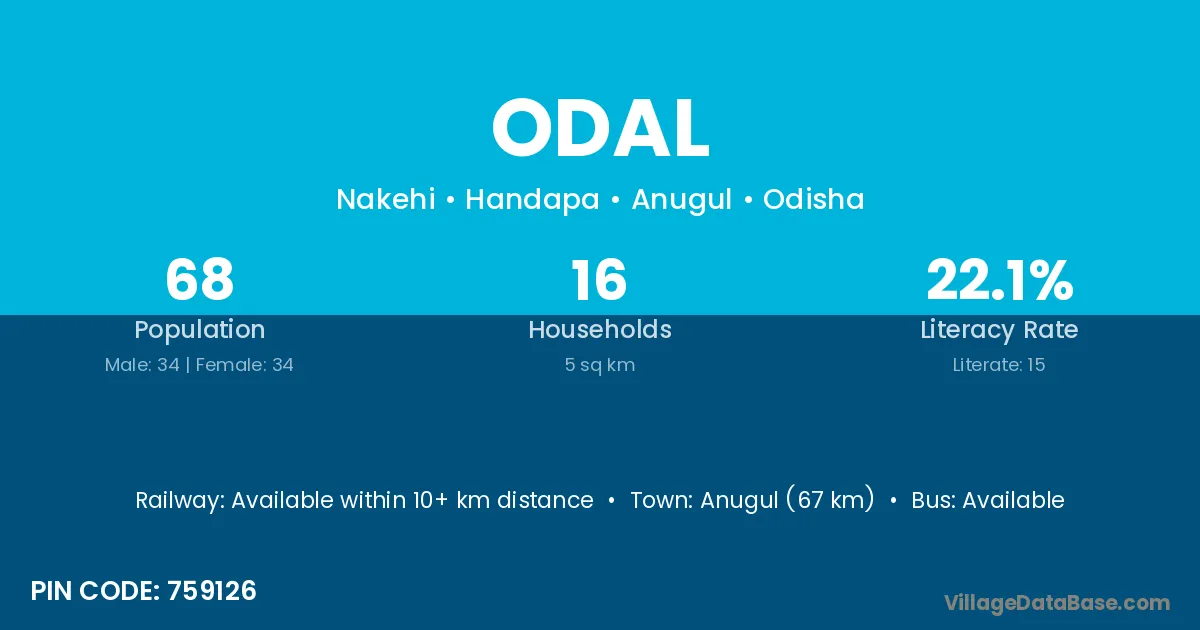 The literacy rate of Odal village is 78.38%. Male literacy stands at 92.86% and female literacy at 66.34%.