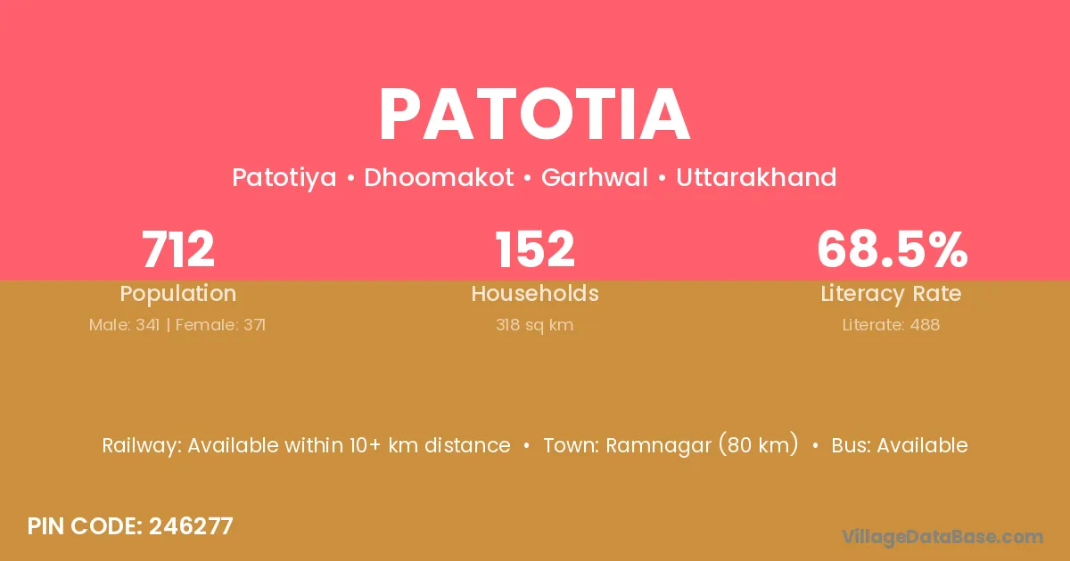 Lansdowne (67 km) is the nearest town to Patotia village for major economic activities and is located approximately 67 km away.