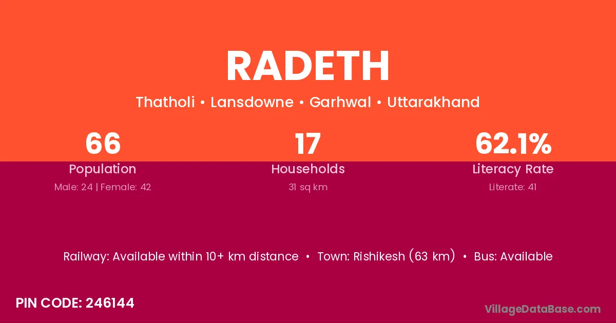 Radeth village has a total population of 66 people, of which 24 are males and 42 are females.