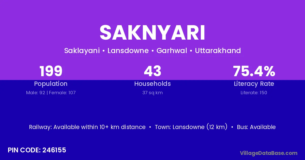 Lansdowne (12 km) is the nearest town to Saknyari village for major economic activities and is located approximately 12 km away.