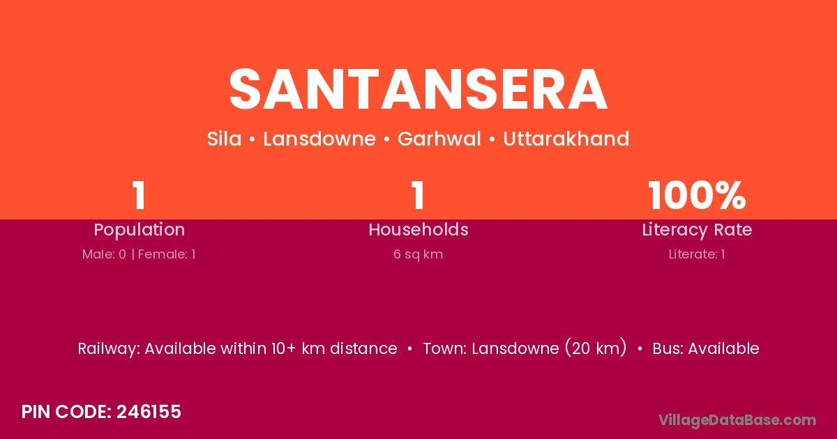 Lansdowne (20 km) is the nearest town to Santansera village for major economic activities and is located approximately 20 km away.