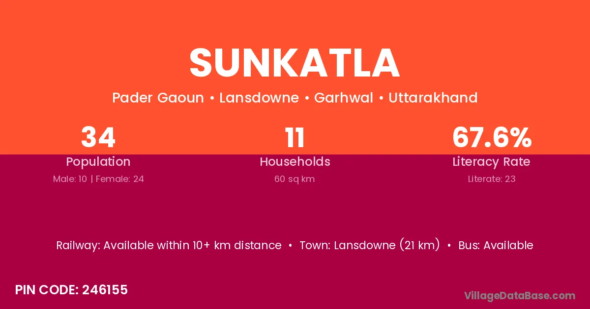 Sunkatla village has a total population of 34 people, of which 10 are males and 24 are females.