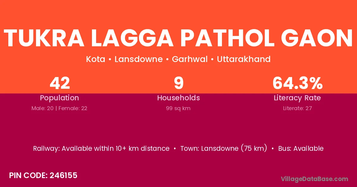 Lansdowne (75 km) is the nearest town to Tukra Lagga Pathol Gaon village for major economic activities and is located approximately 75 km away.