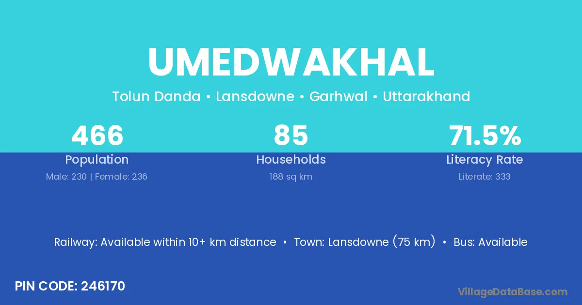 Lansdowne (75 km) is the nearest town to Umedwakhal village for major economic activities and is located approximately 75 km away.