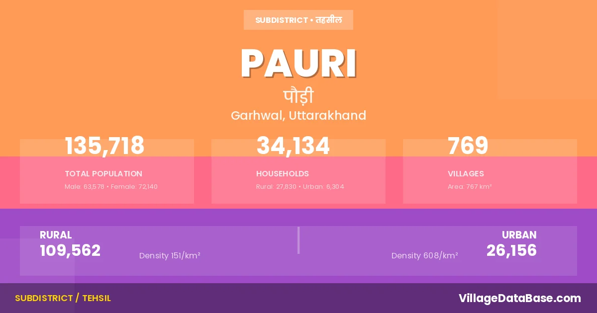 According to the 2011 census The total area of Pauri Tehsil is 767 km², with a population of 135718 people. The population density is 177 inhabitants per square kilometre, and there are approximately 34134 houses in the sub district.