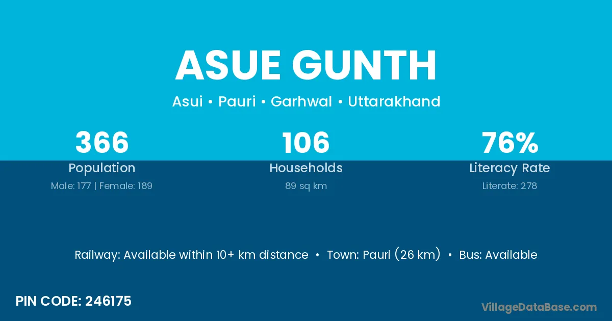 Pauri (26 km) is the nearest town to Asue Gunth village for major economic activities and is located approximately 26 km away.