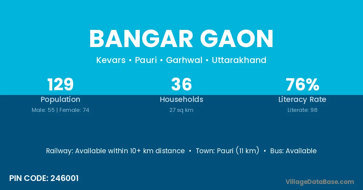 Pauri (11 km) is the nearest town to Bangar Gaon village for major economic activities and is located approximately 11 km away.