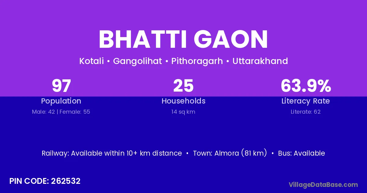 Pauri (20 km) is the nearest town to Bhatti Gaon village for major economic activities and is located approximately 20 km away.