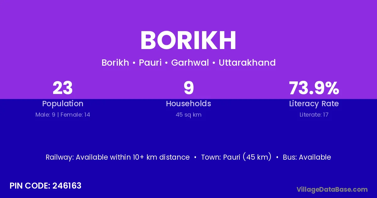 Pauri (45 km) is the nearest town to Borikh village for major economic activities and is located approximately 45 km away.