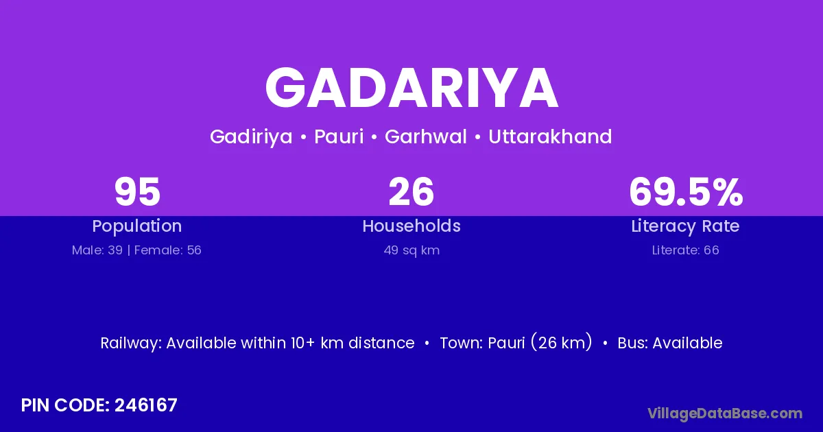 Pauri (26 km) is the nearest town to Gadariya village for major economic activities and is located approximately 26 km away.