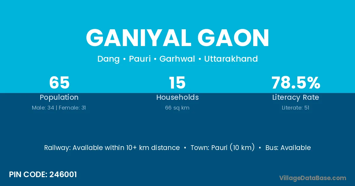 Pauri (10 km) is the nearest town to Ganiyal Gaon village for major economic activities and is located approximately 10 km away.