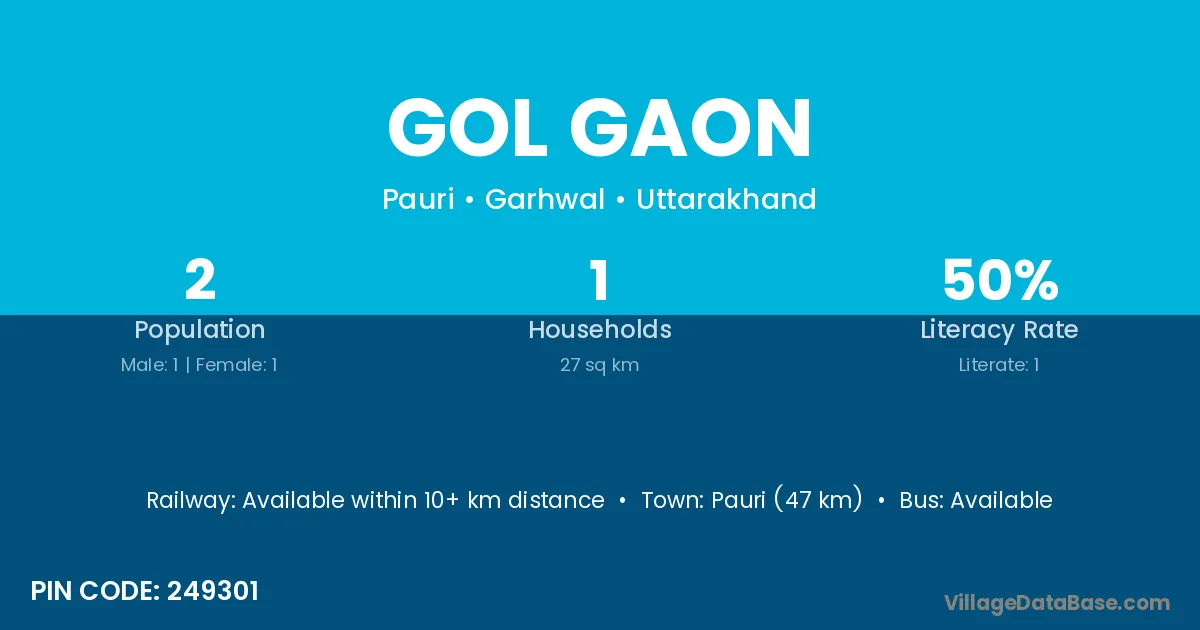 Pauri (47 km) is the nearest town to Gol Gaon village for major economic activities and is located approximately 47 km away.