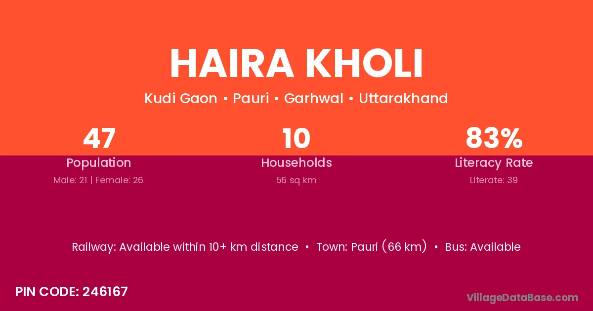 Haira Kholi village has a total population of 47 people, of which 21 are males and 26 are females.
