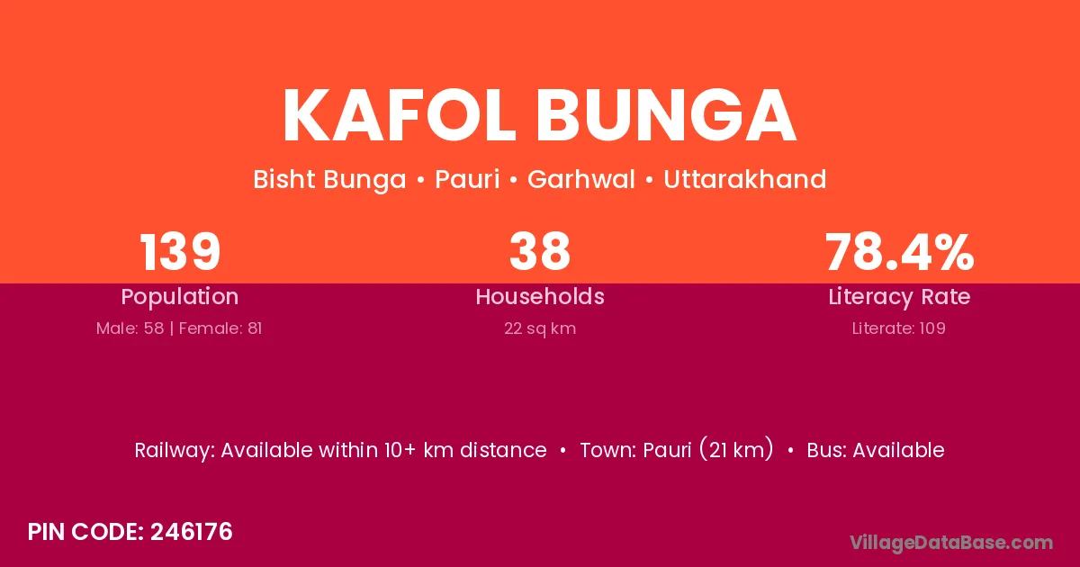 Pauri (21 km) is the nearest town to Kafol Bunga village for major economic activities and is located approximately 21 km away.