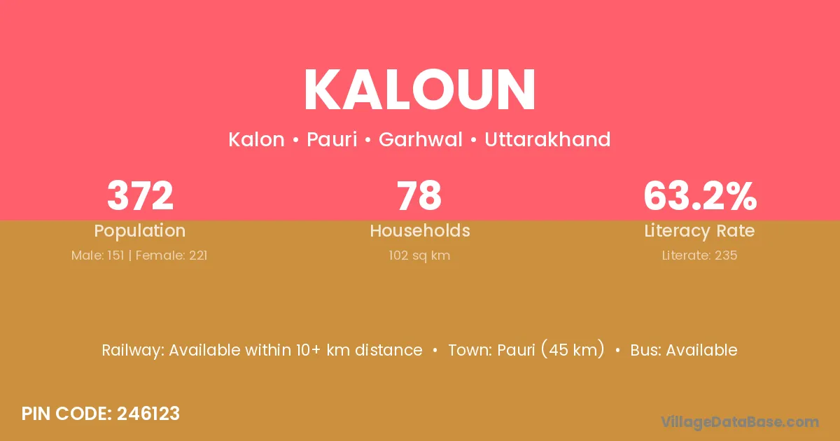 Pauri (45 km) is the nearest town to Kaloun village for major economic activities and is located approximately 45 km away.