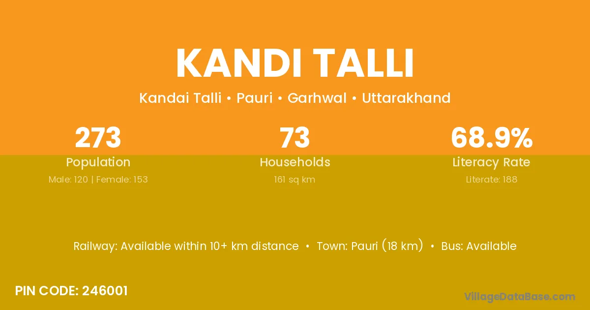 Pauri (18 km) is the nearest town to Kandi Talli village for major economic activities and is located approximately 18 km away.