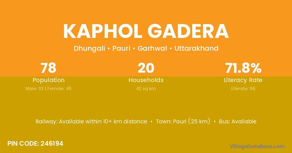 Pauri (25 km) is the nearest town to Kaphol Gadera village for major economic activities and is located approximately 25 km away.