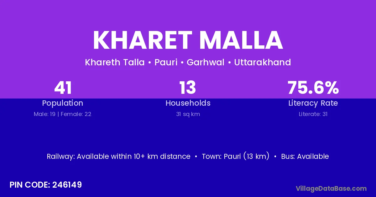 Pauri (13 km) is the nearest town to Kharet Malla village for major economic activities and is located approximately 13 km away.