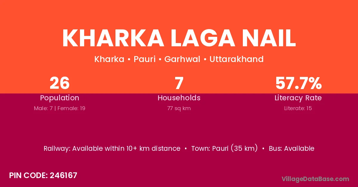 Pauri (35 km) is the nearest town to Kharka Laga Nail village for major economic activities and is located approximately 35 km away.