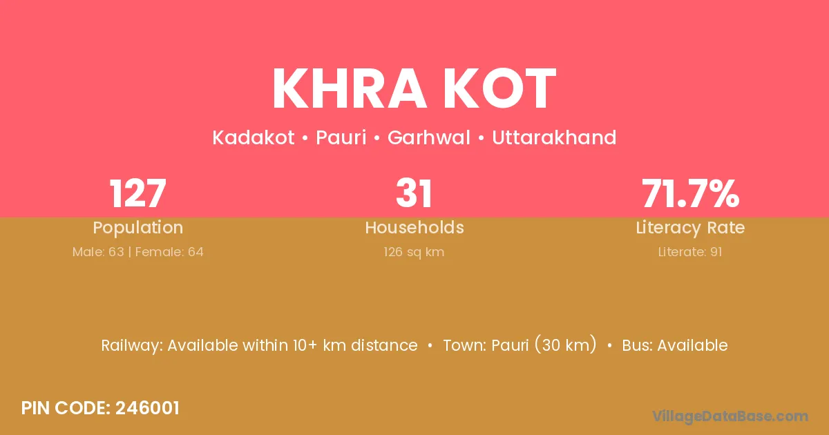 Pauri (30 km) is the nearest town to Khra Kot village for major economic activities and is located approximately 30 km away.