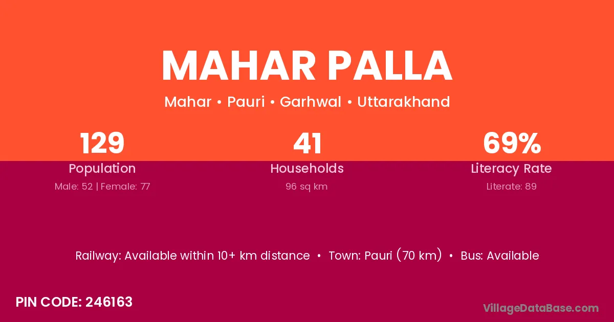 Pauri (70 km) is the nearest town to Mahar Palla village for major economic activities and is located approximately 70 km away.