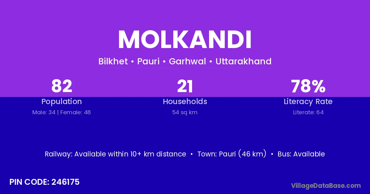 Pauri (46 km) is the nearest town to Molkandi village for major economic activities and is located approximately 46 km away.