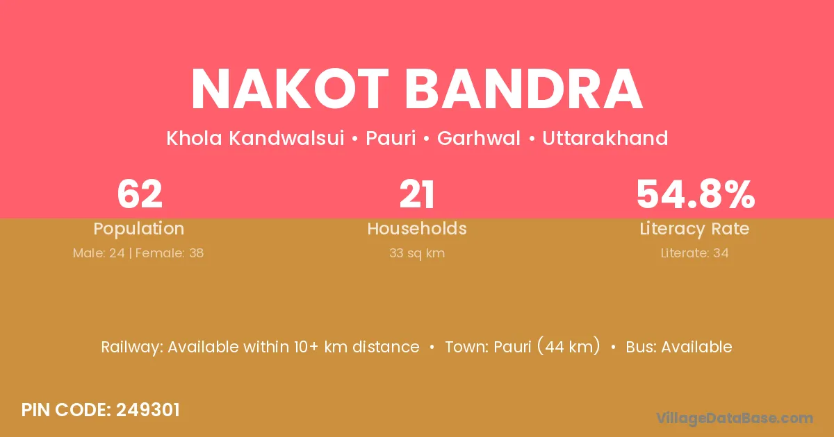 Pauri (44 km) is the nearest town to Nakot Bandra village for major economic activities and is located approximately 44 km away.