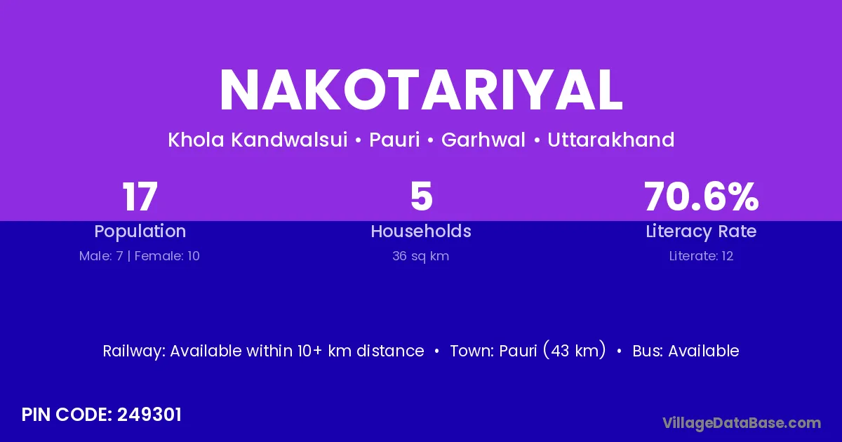 Pauri (43 km) is the nearest town to Nakotariyal village for major economic activities and is located approximately 43 km away.