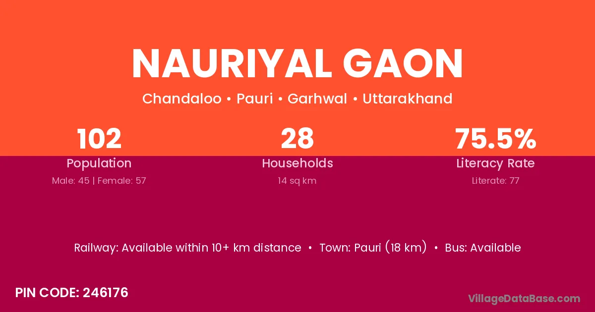Nauriyal Gaon village has a total population of 102 people, of which 45 are males and 57 are females.