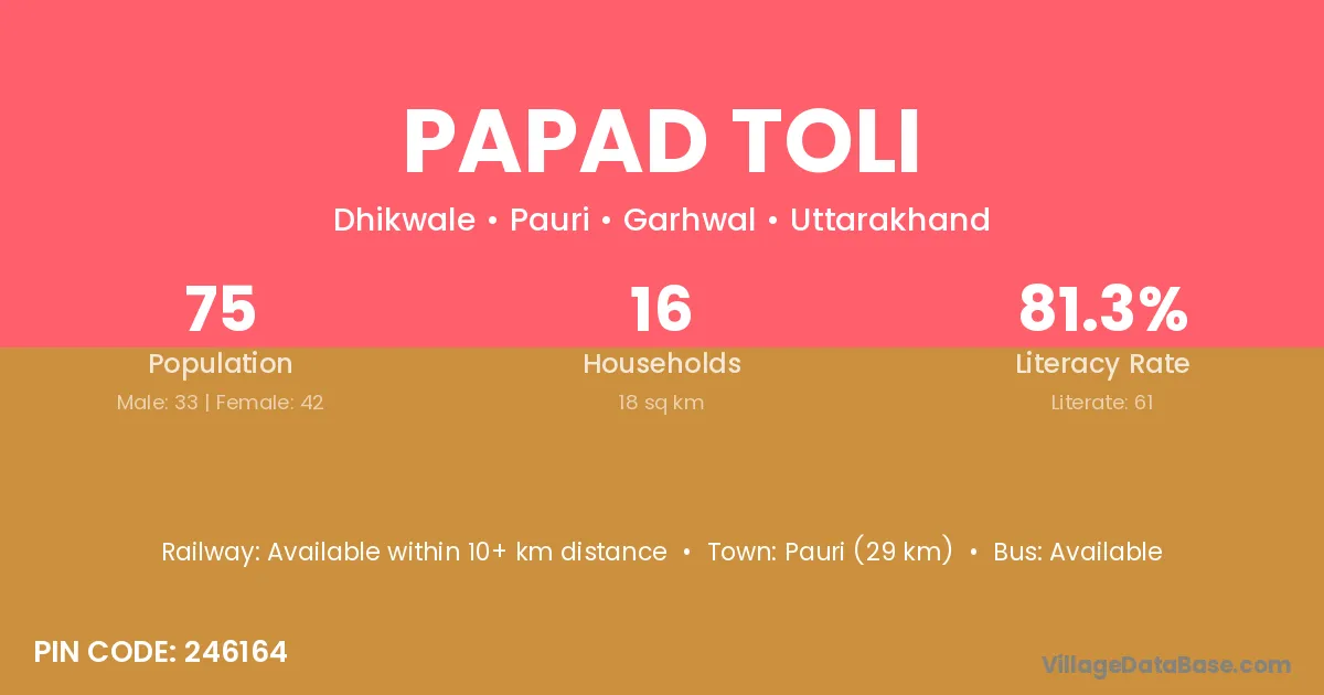 Pauri (29 km) is the nearest town to Papad Toli village for major economic activities and is located approximately 29 km away.