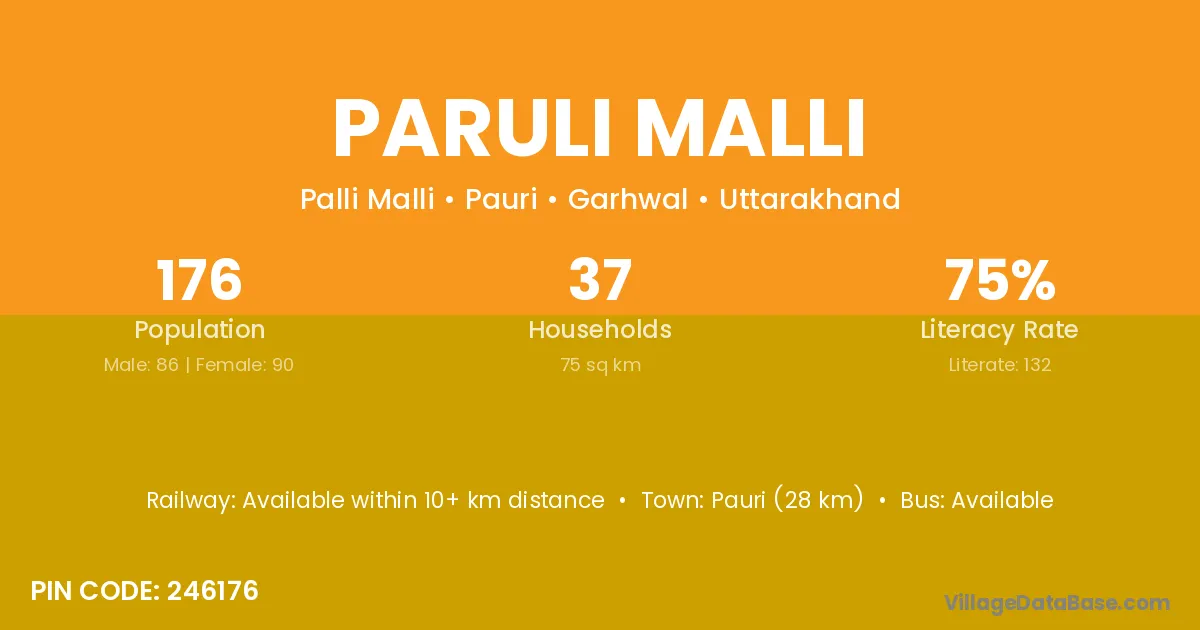 Pauri (28 km) is the nearest town to Paruli Malli village for major economic activities and is located approximately 28 km away.