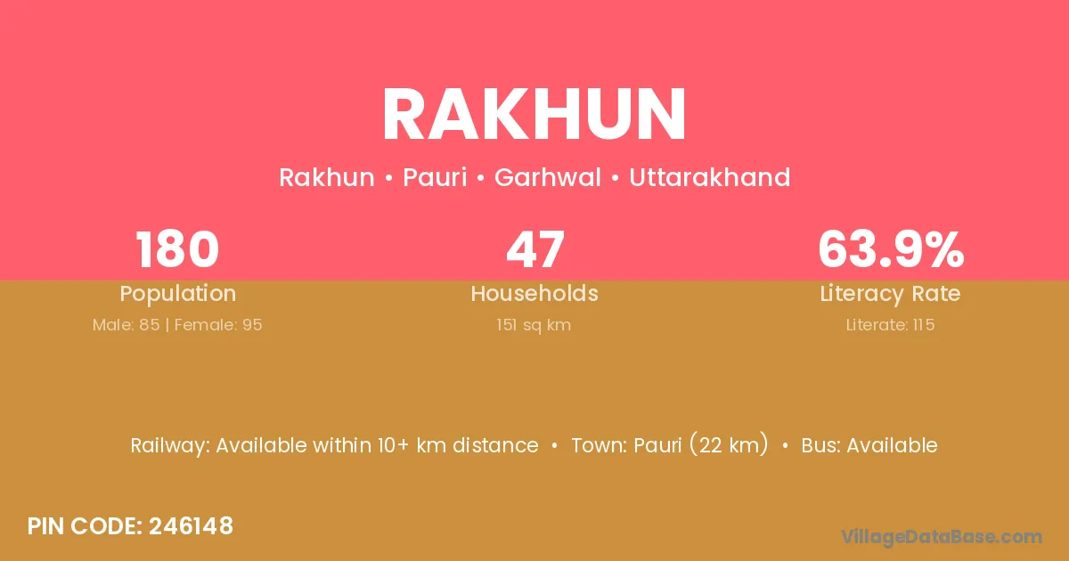 Pauri (22 km) is the nearest town to Rakhun village for major economic activities and is located approximately 22 km away.