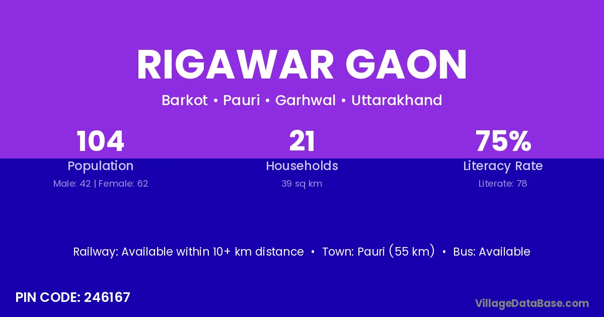 Pauri (55 km) is the nearest town to Rigawar Gaon village for major economic activities and is located approximately 55 km away.