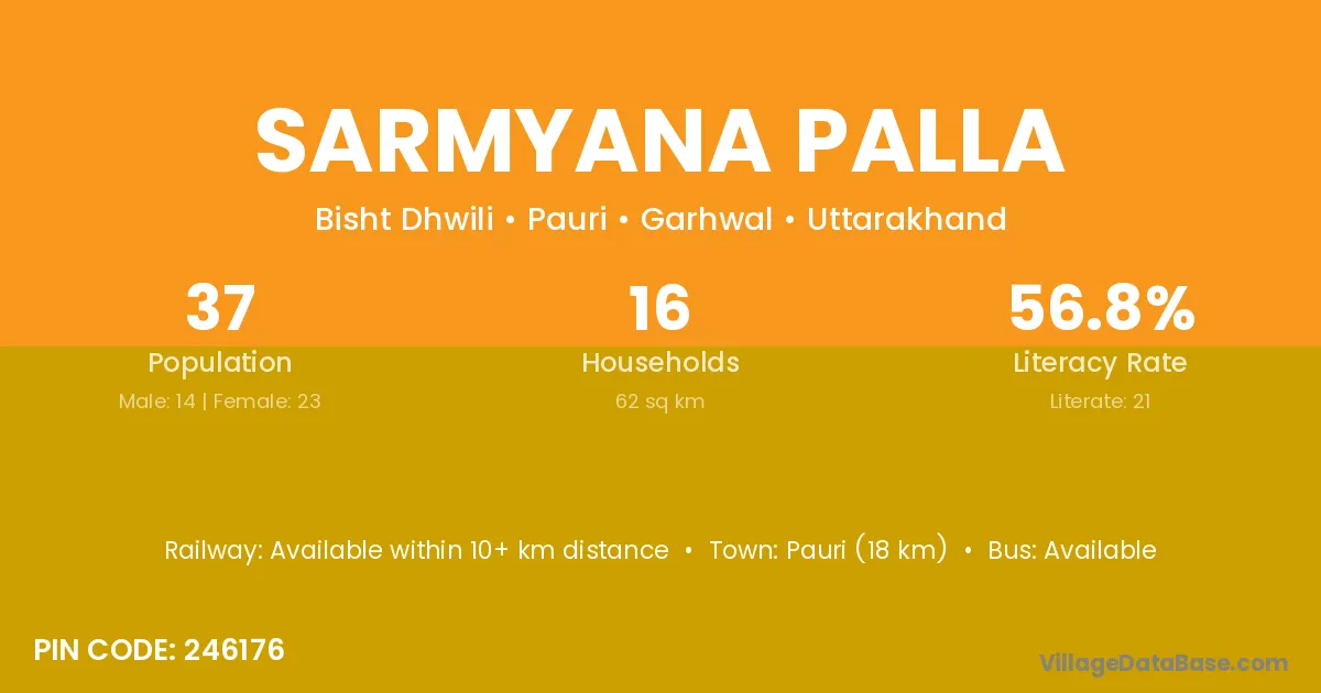 Sarmyana Palla village has a total population of 37 people, of which 14 are males and 23 are females.