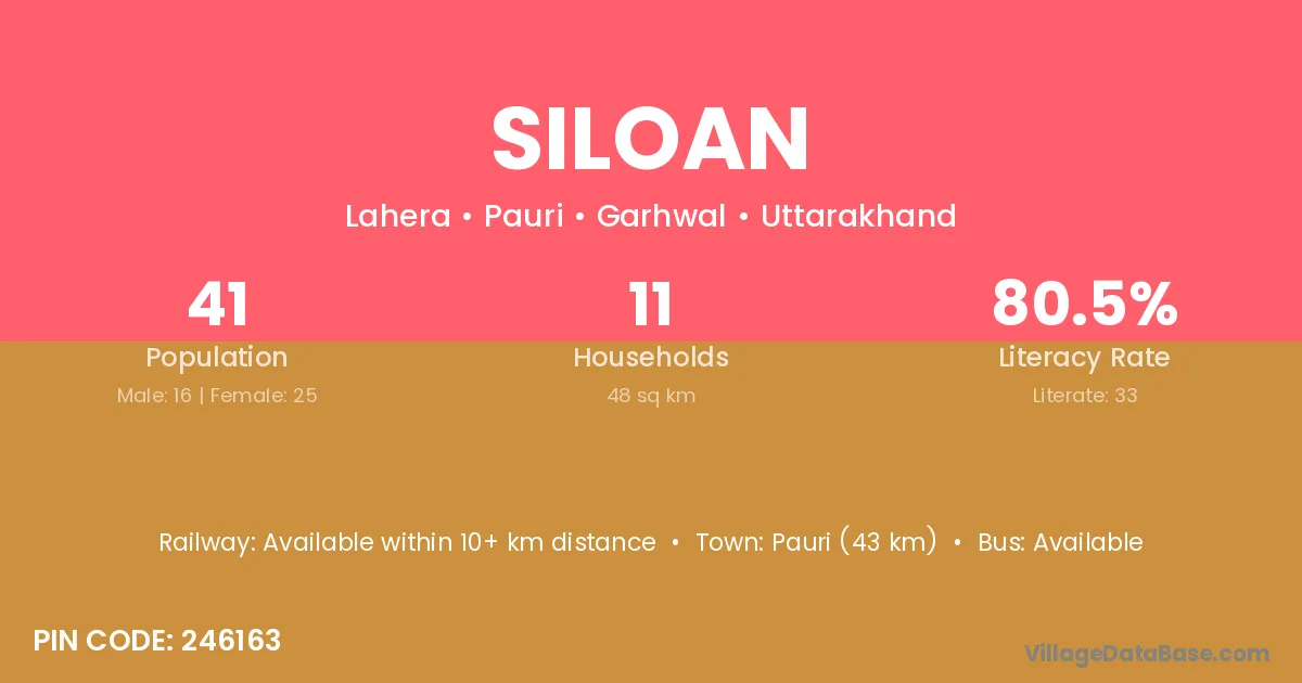 Pauri (43 km) is the nearest town to Siloan village for major economic activities and is located approximately 43 km away.
