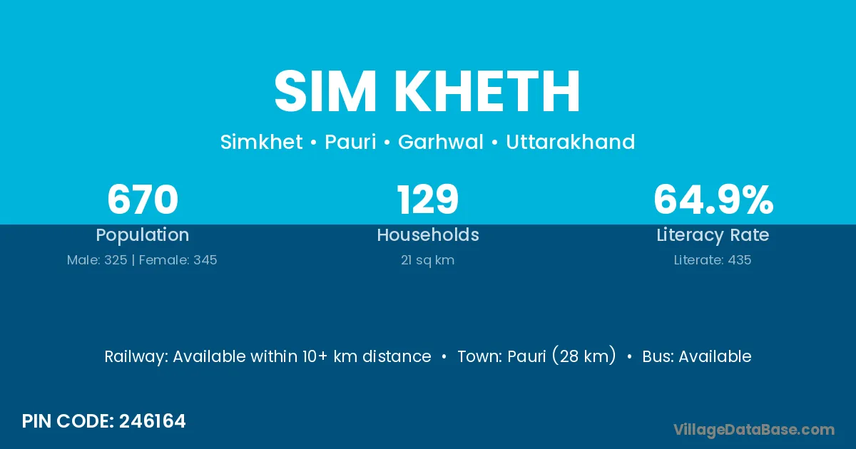 Pauri (28 km) is the nearest town to Sim Kheth village for major economic activities and is located approximately 28 km away.