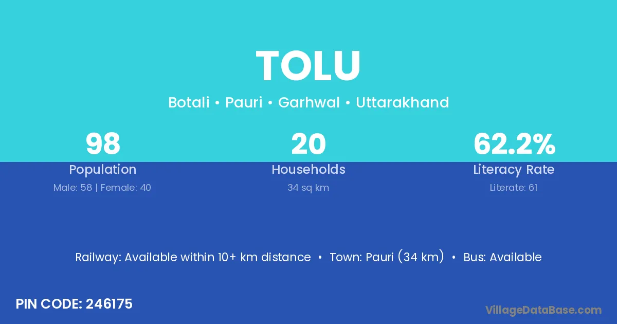 Pauri (34 km) is the nearest town to Tolu village for major economic activities and is located approximately 34 km away.