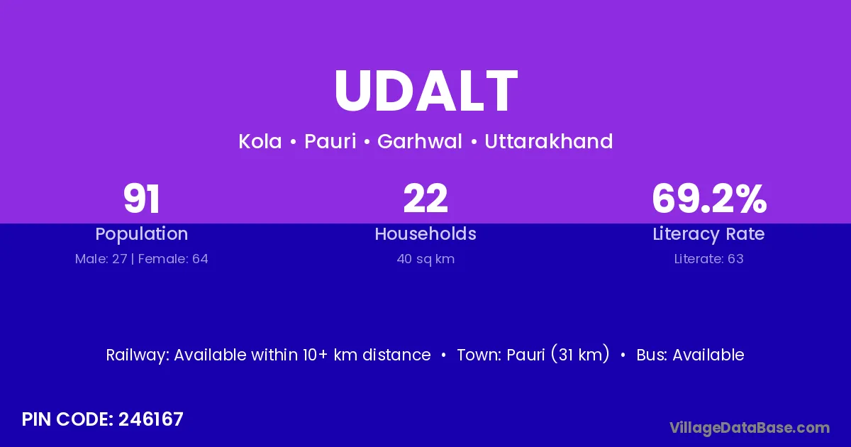 Pauri (31 km) is the nearest town to Udalt village for major economic activities and is located approximately 31 km away.