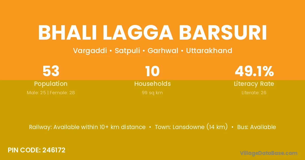 Lansdowne (14 km) is the nearest town to Bhali Lagga Barsuri village for major economic activities and is located approximately 14 km away.